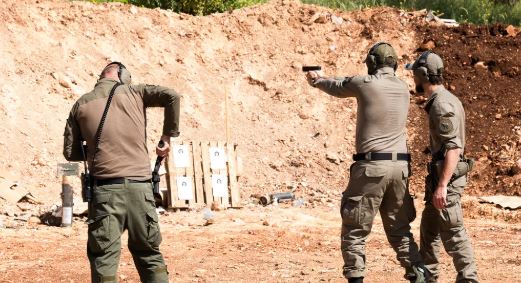 Une équipe d’intervention d’urgence civile s’entraîne au tir dans la ville de Kiryat Shmona, qui se trouve à portée des barrages de roquettes tirés par le Hezbollah depuis le Liban, le 4 mars 2024. (Erez Ben Simon/TPS-IL)