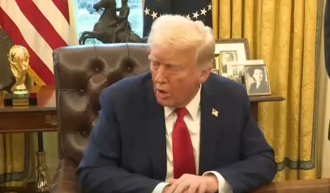 Trump explique aux journalistes qu’il n’est pas bon qu’Israël soit si petit, de la taille de son stylo par rapport à la taille de la table qui représente comparativement le moyen orient